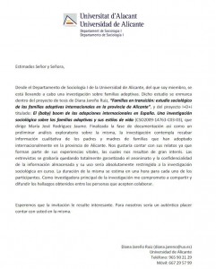 La Universidad de Alicante está llevando a cabo una investigación sobre familias adoptivas y pide colaboración a todas las familias que hayan adoptado internacionalmente para el estudio sociológico. Todas las familias interesadas por favor que contacten con Diaña Jareño a través de diana.jareno@ua.es