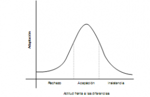 Probablemente en la mayor parte de las adopciones en las que los niños no estén “excesivamente” afectados por el proceso previo a la adopción , bien con su familia biológica o en la institución, bien por su corta edad, etc., a usted le será suficiente con ubicarse en la parte central-izquierda del gráfico (RECHAZO DE LAS DIFERENCIAS). Su paternidad trascurrirá placidamente, quizás en la adolescencia, deba usted de desplazarse un poco a la derecha, porque la criaturita se ha empeñado en recordarle que usted no es su padre biológico, quizás no. Pero en general, a usted le irá bien esta zona del gráfico.