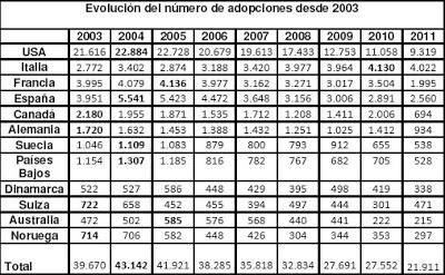 Con un total de algo menos de 22.000 adopciones internacionales para los 12 primeros países de acogida (véase el cuadro siguiente), el descenso iniciado en 2004 continúa de manera inexorable. Los Estados Unidos acusan así un nivel todavía más bajo (9.319), al igual que España y Francia. Para estos países, queda claro que las situaciones de transición, total o parcialmente vinculadas a la