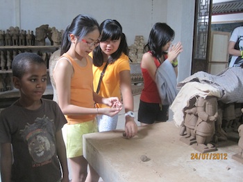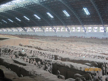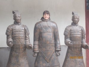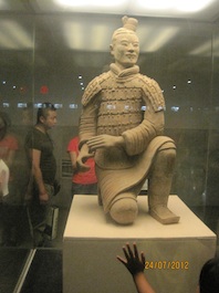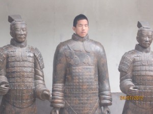 A las ocho de la mañana estábamos todos listos con nuestras maletas en la recepción del hotel, fuimos primero a una fábrica donde nos explicaron en que consistía la terracota y cómo estaban hechos los guerreros, además entre muchísimas risas nos hicimos pasar por uno de ellos. Cuando terminamos esta visita, nos dirigimos al lugar donde se encuentran los guerreros. El lugar como casi todo en China es enorme, y desde la entrada hasta las excavaciones nos dirigimos en un coche eléctrico. Ni el calor ni la cantidad de gente que allí se concentraba impidió que quedáramos impresionados con la visión que descubrimos al entrar en la excavación número uno. Los guerreros son como las pirámides, ya sabes como son pues las conocemos por las innumerables ocasiones en las que las hemos visto en los libros y diferentes medios de comunicación, pero no por ello, cuando las conoces y vives, dejan de impresionarte.