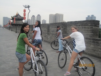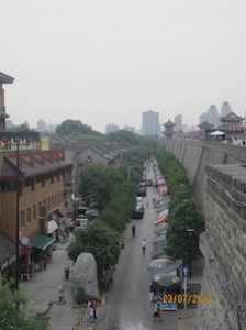 Según llegamos a Xian nos llevaron a comer y sin apenas descanso, fuimos a visitar la muralla de la ciudad que disfrutamos recorriéndola en bicicleta, para sorpresa de la mayoría de los visitantes que esquivábamos en nuestro paseo y alegría de los más pequeños del grupo que se divertían con esta nueva forma de hacer turismo. Mientras dábamos el paseo, las vistas de los tejados de las casas de la ciudad era muy bellas y nos enseñaban como viven sus gentes.