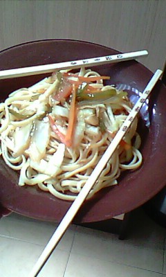 Salsa de soja (Heinz es la marca que más me gusta)Se hierven los tallarines normalmente. Se saltea con un chorro de aceite de girasol la verdura cortada finamente (juliana), que no quede demasiado hecha. Se le agrega una pizca de sal, unas dos cucharadas de salsa de soja y un poquito de miel o azúcar. Hacer unos minutillos más. Añadir los tallarines a la sartén y mezclar bien.