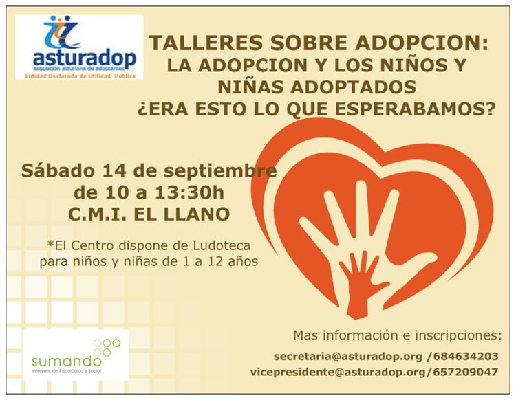 Este sábado 14, taller sobre adopción de Asturadop en el CMI EL LLANO. Para inscribirse: secretaria@asturadop.org o llamar al 684634203. Vía @Asturadop